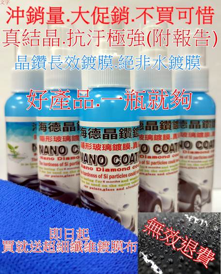 使用方法簡單.清潔表面後擦乾,即噴即擦即可.快速又方便.自己就能輕鬆完成鍍膜 運作原理:鍍晶在玻璃形成緻密防護層將玻璃與空氣隔離,從而顯著減少外界帶來的傷害。 可防止玻璃及其表面氧化退色、抗酸鹼腐蝕,顯著提升玻璃疏水和抗污姓, 對減少細微划痕產生也具有良好作用,是玻璃在惡劣環境中保持長久光亮如新的秘密武器。 --------------------------------------------------------------------------------------------------------- 玻璃表面處理前:一般玻璃窗戶因表面能高,會有親水性的表現,相對的髒污容易附著, 一但污垢沾附時除非使用清潔劑否則很難去除髒污,擦拭時也會有很嚴重的澀感(摩擦力大) 玻璃表面鍍膜後:玻璃表面能低,因此形成水滴疏水表面,水珠不易附著,且表面滑順更容易擦拭 --------------------------------------------------------------------------------------------------------- 絕對非市場銷售低價一次性鍍膜,絕對非市場銷售低價一次性鍍膜,絕對非市場銷售低價一次性鍍膜很重要所以講三次,不會因為洗車後鍍膜就不見了,因為我們的是真結晶鍍膜 使用後時間長效,保證讓您滿意